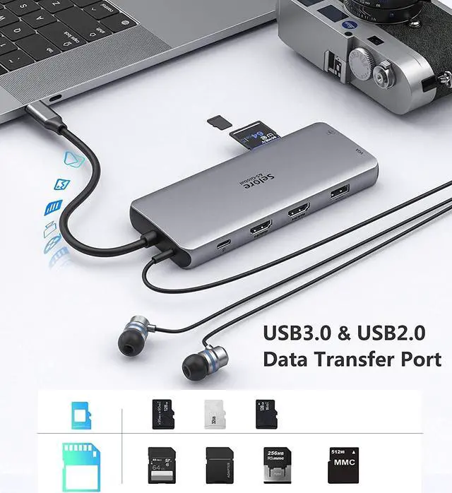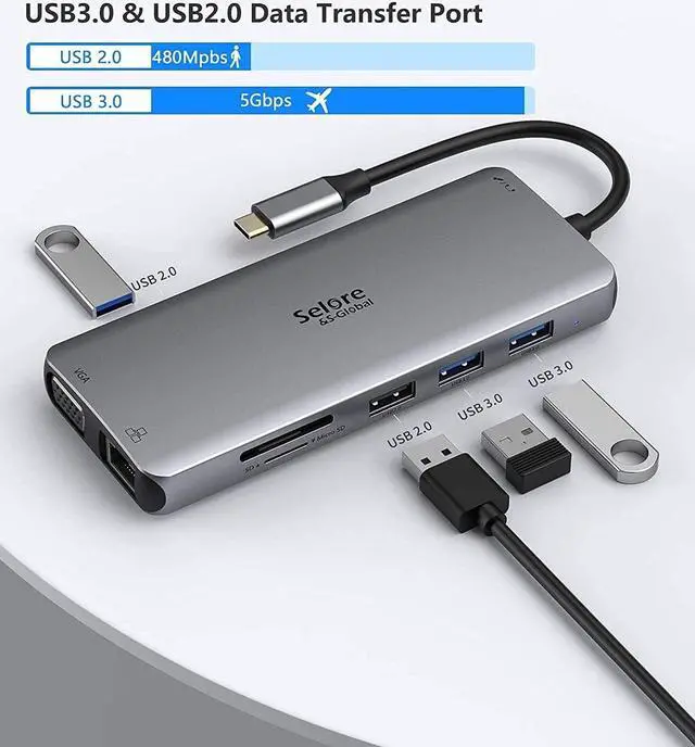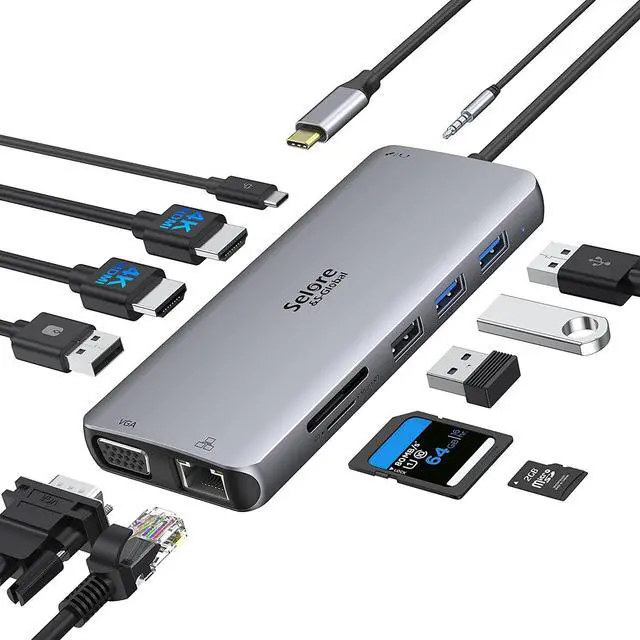 Selore&S-Global 16 in 1 USB C Quadruple Display Docking Station to expand your laptop to 2HDMI + DP + VGA + RJ45 + 1USB3.1 + USB C data transfer + 2USB3.0 + 2USB2.0 + PD3.0 + LAN + Audio & Mic + SD/TF; universal dock will meet your different needs at work.