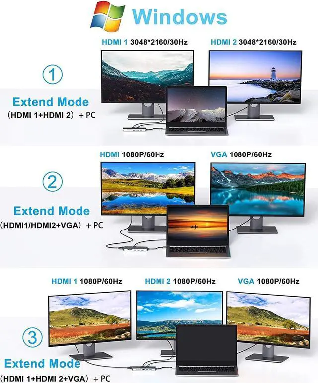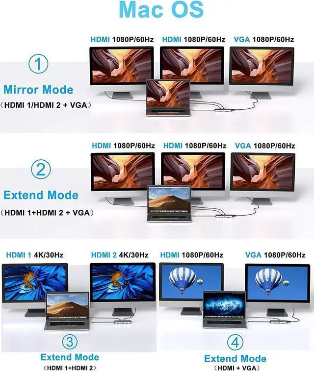 • [Triple Display USB C Multiport Adapter]:USB C Dual HDMI Adapter supports mirror mode (SST) and extend mode (MST). In Mirror Mode, all the monitor images will be the same. In Extend Mode, the images of the monitor are different. Single HDMI 1 Output: 4K@60Hz (While the source is DP1.4). Dual HDMI Output: 4K@30Hz. Dual HDMI & VGA Output: 1080P/60Hz. (NOTE: All external monitor images are same on MacOS due to OS system limit. ONLY Windows systems can display different images on extended monitor)