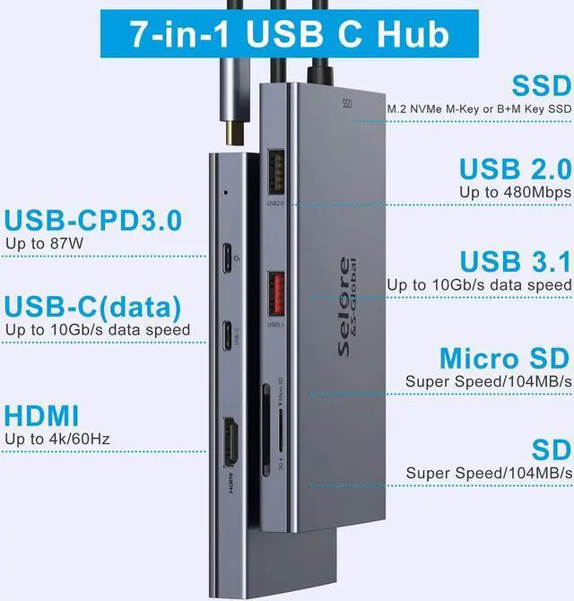 SELORE USB-C Multiport Hub with USB3.1/Type-C USB 3.0 charging port/Thunderbolt 3/USB-C to HDMI Port, 2 USB 3.0 Ports, SD & TF Card Reader