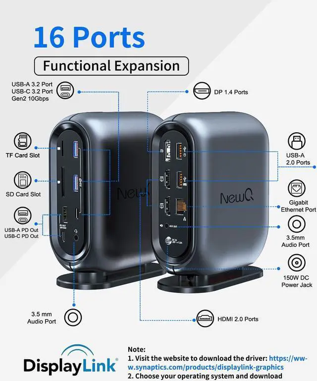 Triple Display USB C Docking Station for M1 M2 MacBook, 16-in-1 DisplayLink Universal Dock with 150W Adapter, HDMI, DP, GEN2 10Gbps, 96W for PC, 18W PD, Audio, RJ45, SD TF, for USB-C, TB 3/4 Laptops