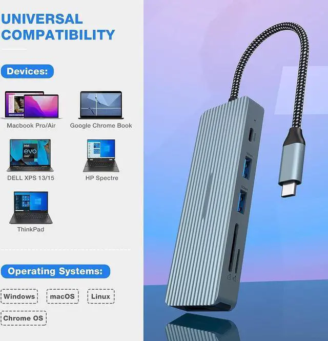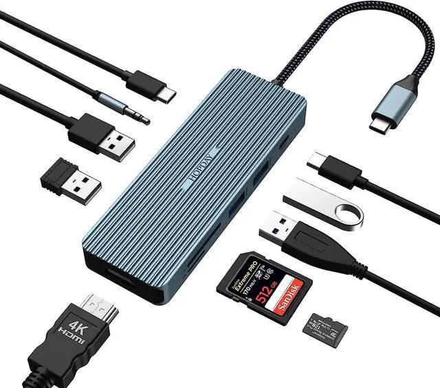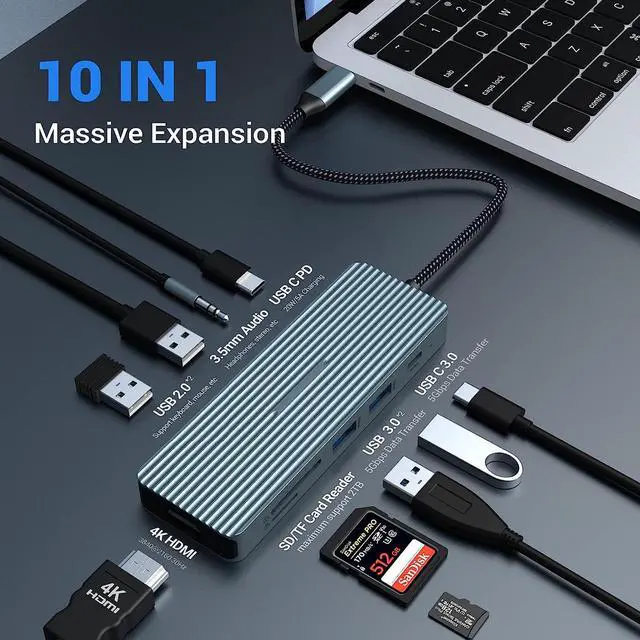 Versatile and Exquisite USB-C Hub This 10-in-1 USB C Multiport Laptop Adapter (2 x USB-A 3.0, 2 x USB-A 2.0, 1 x USB-C 3.0, 1 x 4K HDMI, 1 x 100W PD, 1 x audio / mic jack, 1 x SD card reader, 1 x TF card reader). Plug and Play, no additional software and drivers required. With so many functions, the extend adapter is stiil light and portable to carry. The unibody aluminum exterior creates a modern industrial style, making it resistant to dirt and fingerprints.
