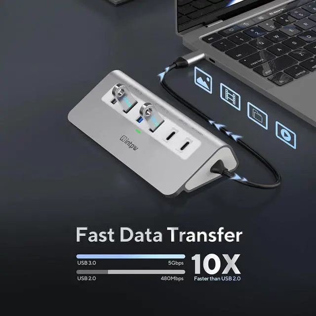 HIGH SPEED CHARGING & TRANSFERING: Charge your Macbook with ease using the 100W USB-C PD charging port on this usb c hub multiple adapter while connecting multiple peripherals for data transferring and worry-free power storage. 3 USB 3.0 Ports transfer speed up to 5Gbps. It takes only a few seconds to transfer photos or videos to your laptop. 2 USB 2.0 can connect to your keyboard, mouse, USB driver, external disk to your laptop.
