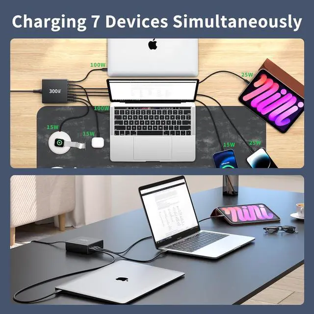 Fast-Speed Charging: It with total 300 watt power. Dual 100W PD PPS. 7port. 4USB C port and 3 USB A. 100W x 2 USB C and 2x25W USB-C Power Delivery Compatible with Smartphone, Tablet, and Laptop, Work For MacBook Pro 13''/ MacBook Pro MacBook Air MacBook, for iPhone 15 Pro max 14/14PLUS/14PRO/14PRO MAX 13/ 13 Mini/ 13 Pro/ 13 Pro Max iPhone 12/ 12 Mini/ 12 Pro/ 12 Pro Max/ Galaxy S21+/ S21/ S21 Ultra/ S21 FE/ S20+/ S20/ for Dell XPS 15/ 13 for Google Pixel iPad Pro 12.9 ''/ iPad Pro 10.5 ''/ iPad Pro 11''/ iPad Mini Series/ iPad Air Series AirPods Pro. More up to 3× faster than with an original old charger. 3 X15W USB A fast charger port for your other devices.