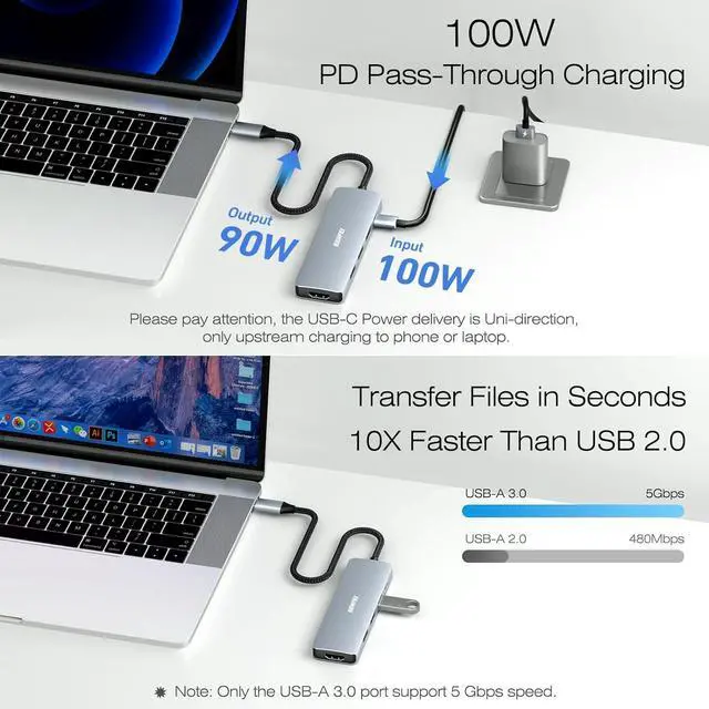 Transfer Files in Seconds: Transfer files and from your laptop at speeds up to 5 Gbps with USB A 3.0 port. Extra 2 USB A 2.0 ports are perfectly for your keyboards and mouse.