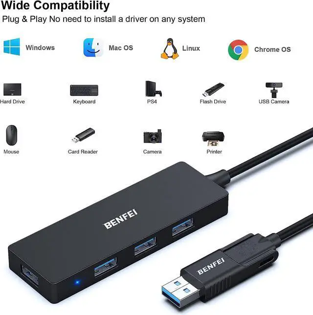 INTEGRATED DESIGN - The integrated-designed BENFEI USB-C/USB 3.0 HUB expands your laptop with 4 addtional USB 3.0 Port. And with 2in1 USB-C/USB 3.0 design, BENFEI USB Hub could works with computer or laptop by USB 3.0 / 2.0 slot or the latest USB Type-C (Thunderbolt 3) slot. A universal card USB Hub solution.