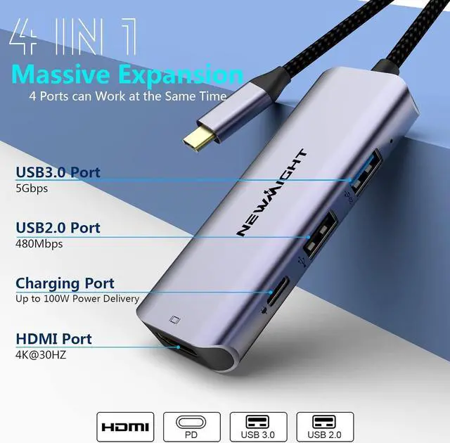 4-in-1 USB C to HDMI Multiport AdapterExpand your USB C Port to a HDMI 4K port, a USB-C port (support PD charging and data transfer), a USB 3.0 type A port and a USB 2.0 port. 4 ports can work at the same time with no extra driver. It perfectly solves the problem of only one usb c port of your laptop. Compact and versatile, convenient for home-theater entertainment, office, exhibition, presentation, teaching etc.