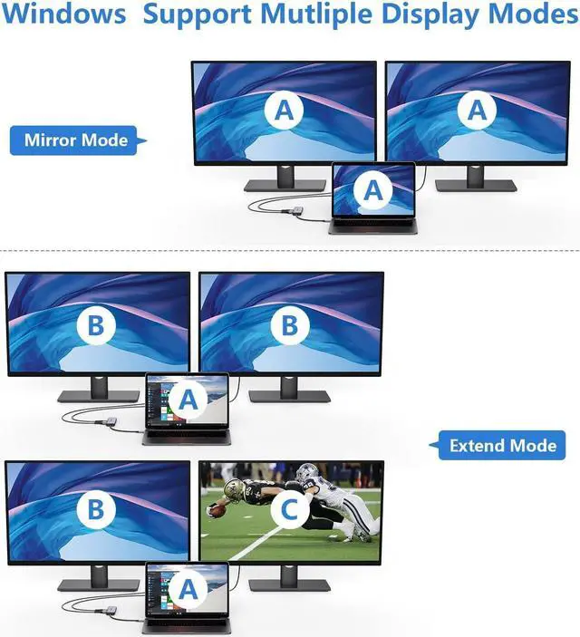 Mirror and Extend ModeSupports three different modes under Windows OS with mirror laptop or extend the screen to two identical or distinct external displays [AAA, ABB, ABC]. Not allow for split screen under Mac OS due to the limit of Mac OS[ Mac laptop supports AAA and ABB only].