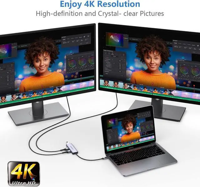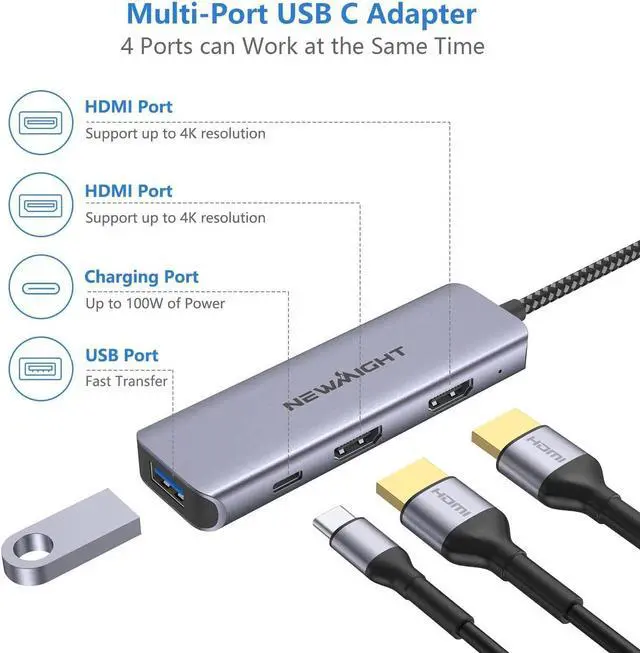USB-C to Dual HDMI Adapter 4 in 1This usb c to dual hdmi adapter resolution is up to 4K(3840X2160P@60HZ), dual monitors with HDMI at 3840x2160@30Hz; This dual monitor adapter allows you to do different project on differnet monitors. Boost your work productivity and efficiency. It is an ideal usb c accessories for photography, programmer, data analysis, etc. No need any drivers or software, just plug and play.