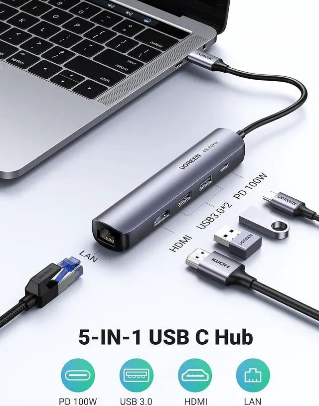 USB C Hub: This 5-in-1 USB-C Hub turns a single USB-C port into 5 ports for data transfer, display expansion, internet connection, and charging.