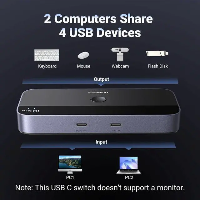 2 USB C PCs Share Multiple USB Pheriperals: The 2-In 4-Out USB C switcher enables 2 computers to share 4 USB Pheripherals like keyboard, mouse, Webcam, Mircrophone, headphone and printer. Good Solution to limit desk space with switching keyboard and mouse from PC to another PC via a button, boosting your productivity