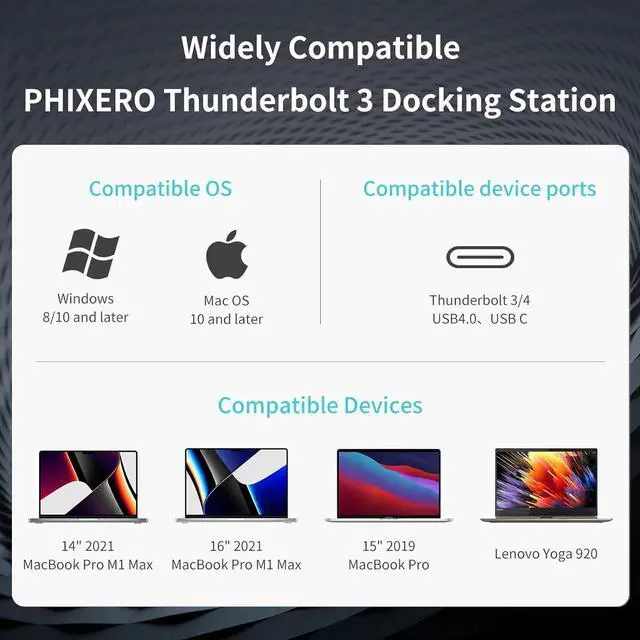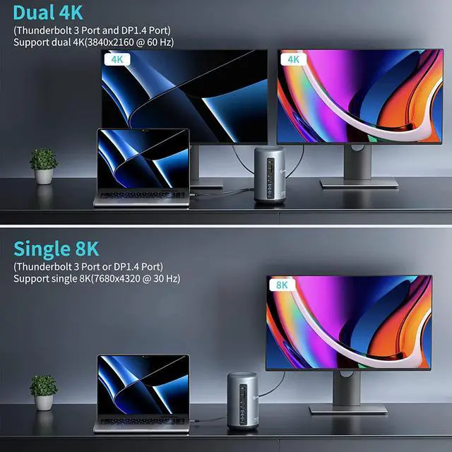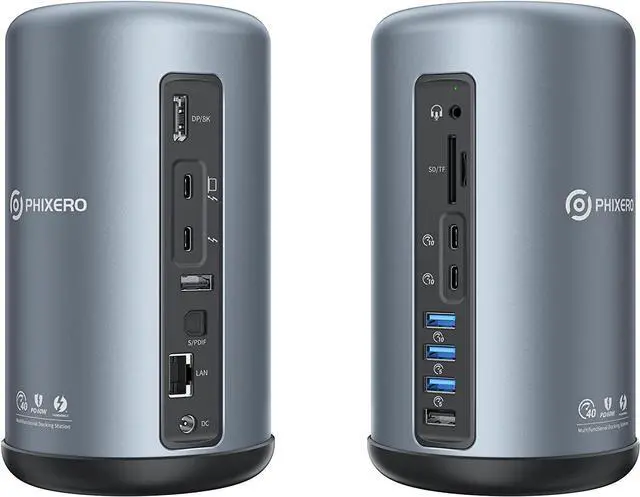 PHIXERO Thunderbolt 3 dock has the function of supporting dual 4K@60Hz video screen output. It can output up to 8K@30Hz display through the DP interface. It adopts the Thunderbolt 3 interface and PD1.4 protocol, and has enough bandwidth to achieve dual 4K@60Hz video screen expansion.
