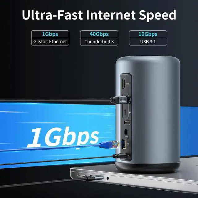 This 16-in-1 Thunderbolt 3 Dock is Intel certified and features 2xThunderbolt 3 in/out ports (40Gbps), 2xUSB C (10Gbps), 1xDP port (8K@60Hz), 1xUSB 3.1 (10Gbps), 2xUSB 3.0 (5Gbps), 1x Gigabit Ethernet, 1x SD/TF, 1x S/PDIF, 1x 3.5mm Audio/Mic, 2x USB 2.0 (for wireless) and 1x device charging port (65W), all port rates and charging power are tested and compliant.