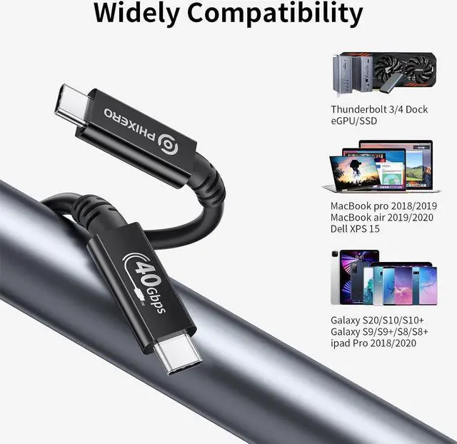 USB 4.0 cable is widely compatible and can be perfectly compatible with Thunderbolt 4 cable, Thunderbolt 3 cable, and USB 4 cable, so it can be well applied to various Thunderbolt devices, such as Thunderbolt 3/4 port laptops, Thunderbolt 3 Docking station, eGPU, PSSD, etc., enough to meet the data transfer and charging needs of your daily equipment