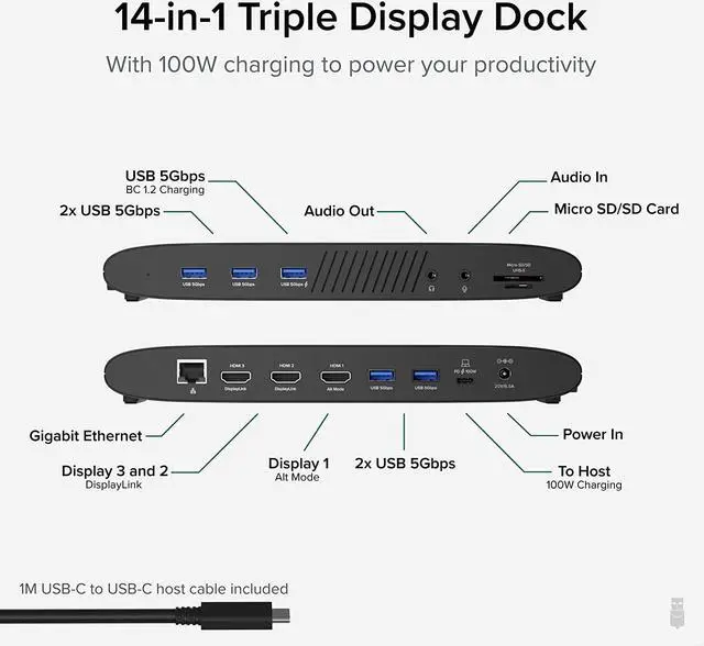 With this docking station, you can connect up to three additional HDMI displays, giving you a large and spacious workspace to multitask with ease. And with 100W charging, five USB 3.0 ports, Gigabit Ethernet, an SD and microSD card reader, and an audio input/output jack, you'll have all the necessary ports and connections to streamline your workflow.