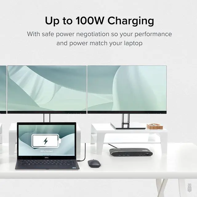 The laptop docking station offers USB Power Delivery up to 100W no more climbing under the desk to get plugged in.