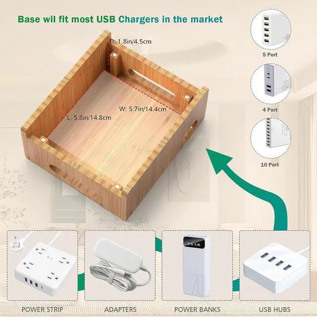 With a spacious compartment (6.6*5.7*2.2inch), you can place USB charger HUB 4/5/6 ports inside while hiding all the cables. Keep the surrounding environment clean and tidy.