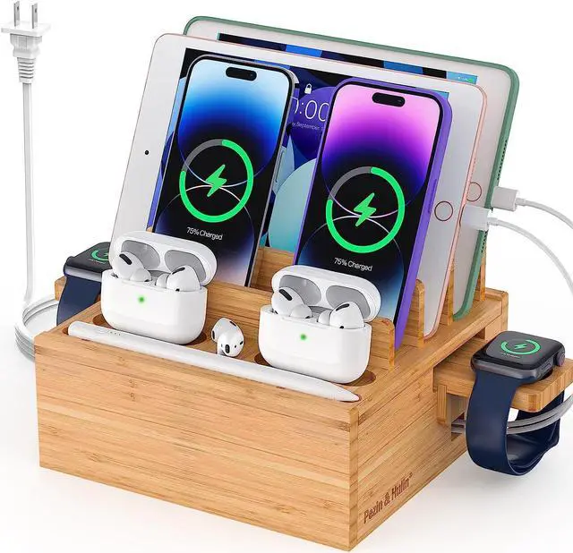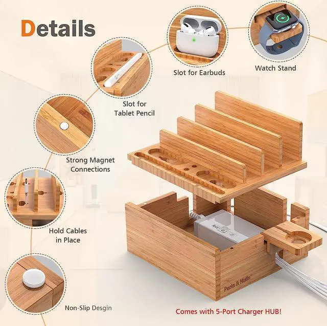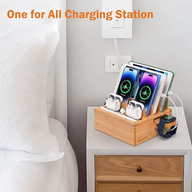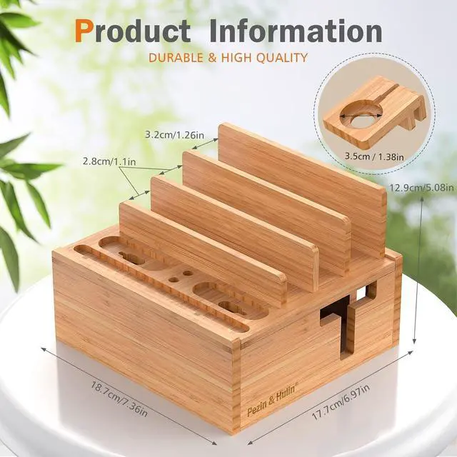 Multi-device Organizer: Pezin & Hulin bamboo charging station can hold up to six devices, simultaneous maintaining your devices in order.