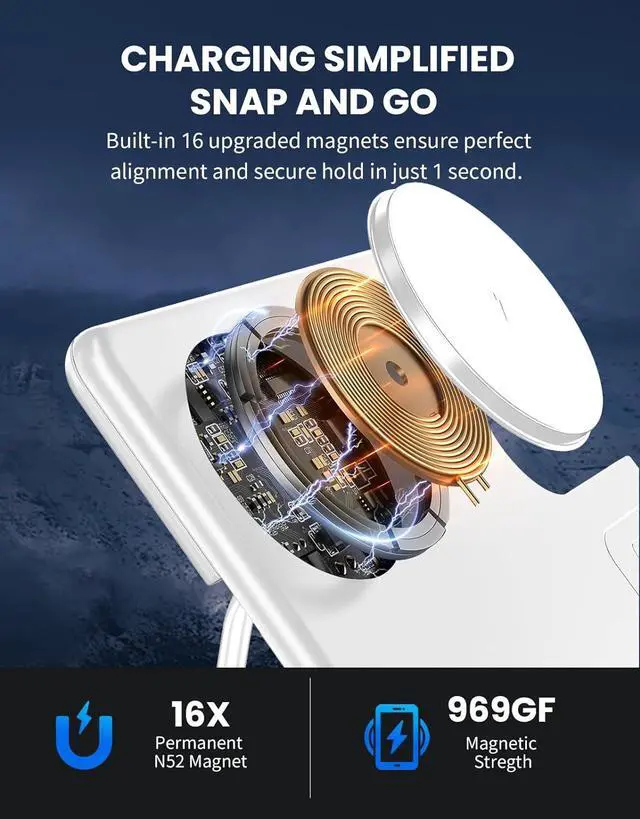 3 in 1 Wireless Charger: Wireless charging stand can charge iPhone / AirPods / iWatch at the same time. The built-in magnetic Apple Watch charger allows the iWatch to be automatically aligned. With dual charging coil design, eliminate the hassle of finding the "Best Location" when charge your iPhone.