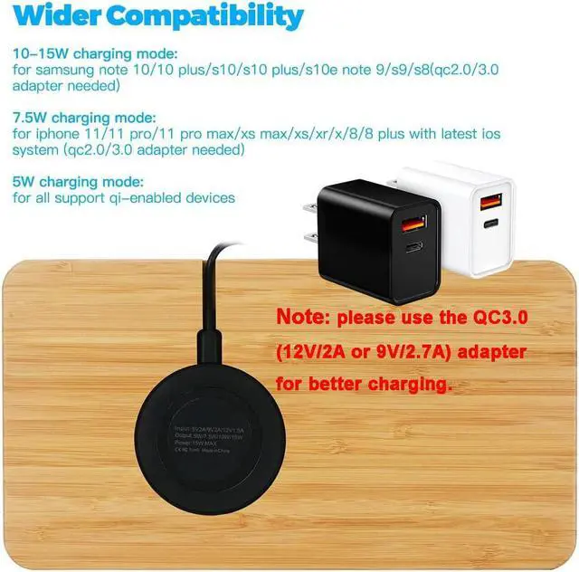 Widely Compatible For Multiple DevicesThis wood charger docking station the wireless power 10W charging mode is For Samsung, 7.5W charging mode is for iPhone , 5W charging mode works on any Qi-enabled devices android phone