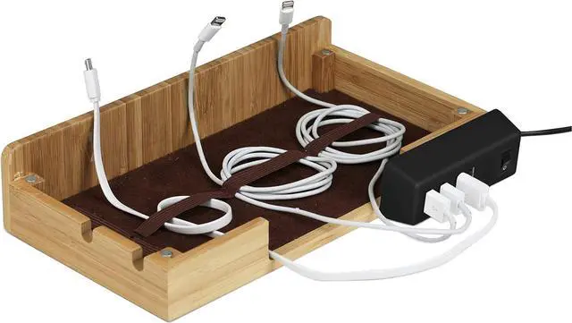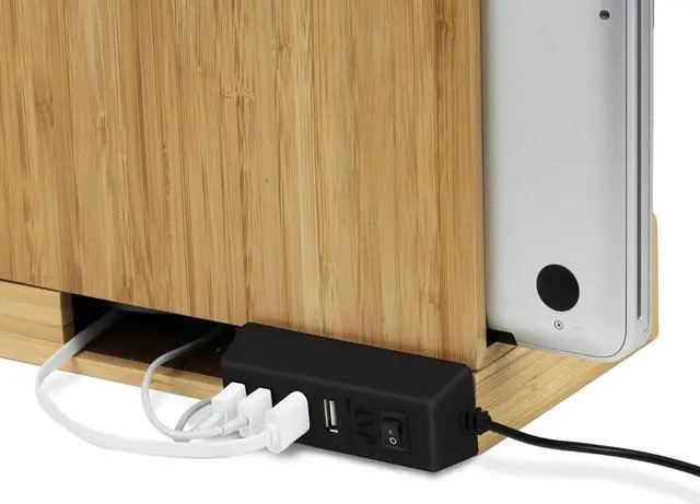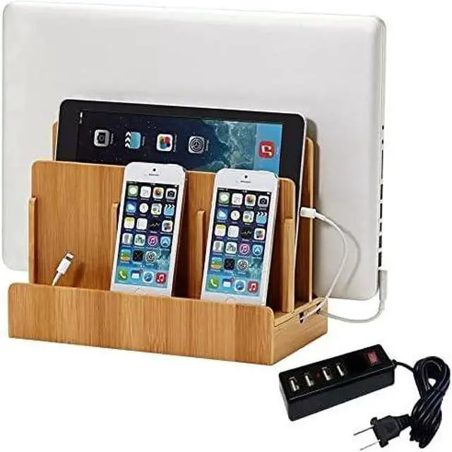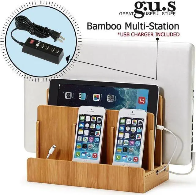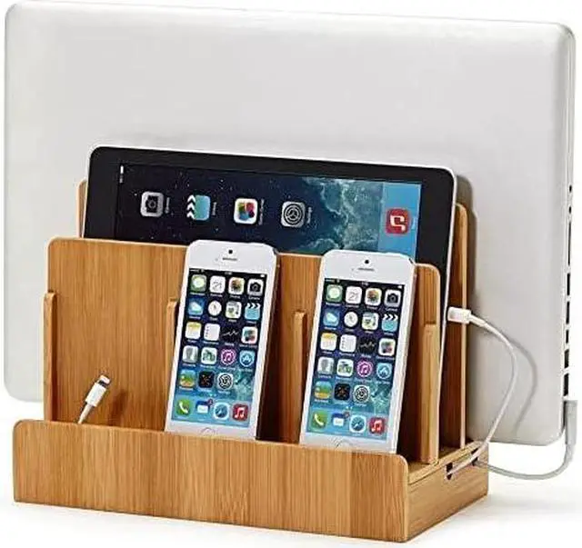 Turn any desk or table into a professional home office with our Original Multi Charging Station. This dock charges up to 5 devices simultaneously so you're always ready-to-go. Say goodbye to tangled cords and chargers and power up like a professional. Misplaced chargers and tangled cords are now things of the past - all thanks to our (patented) Original Multi Charging Station. Keep all your chargers in one place and forget about them for good! This charging station is designed to accommodate all of your electronic devices - from heavy laptops (up to 1.25" thick) and tablets/e-readers, to your smartphones (all smartphones - 3 slots)! Built ergonomically with 100% Eco Friendly Bamboo Attractive - Premium 100% wood. - Our charging station is the perfect gift for anyone working from home, organizing their home office, entry-way, kitchen, or nightstand. It also looks great in any conference room or corporate office. The Original Multi Charging Station measures 10" L x 9" H x 5.5" W. The bottom tray internal dimensions (approx) are 9.5" L x 1.50" H x 4.75" W. The vertical slots measure 1.25" wide and accommodate most laptops and tablets. Universal compatibility with all consumer grade cell phones, tablets/e-readers, and laptops (up to 1.25" thick) Return Policy -- Except in instances of damage, defect, or error in our fulfillment, monogrammed products are not eligible for return or exchange. Each personalization is performed especially for your order; please, take extra care when selecting your item's color/size, monogram directive, and the vinyl monogram color. This design is a licensed Trademark. Reg. No. 4733389 Licensed under U.S. Patent No. 6982542