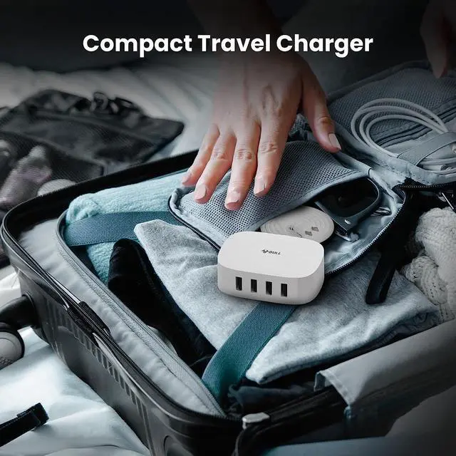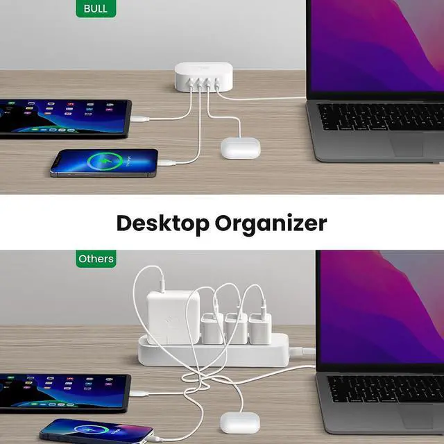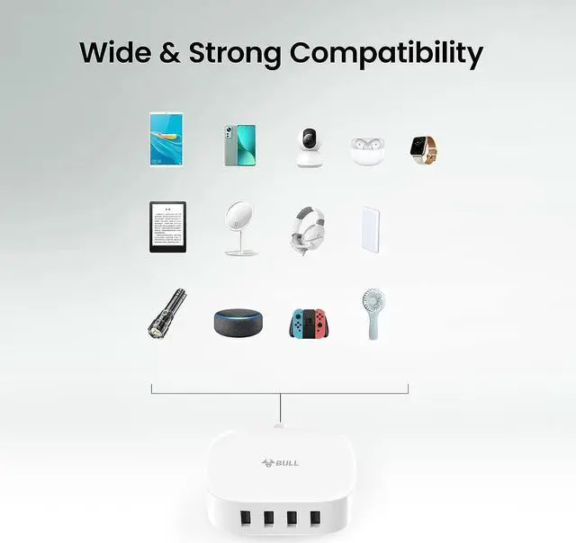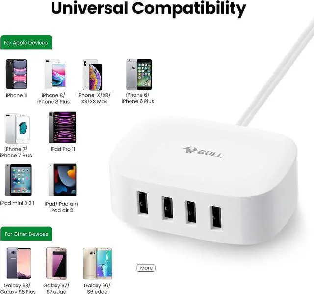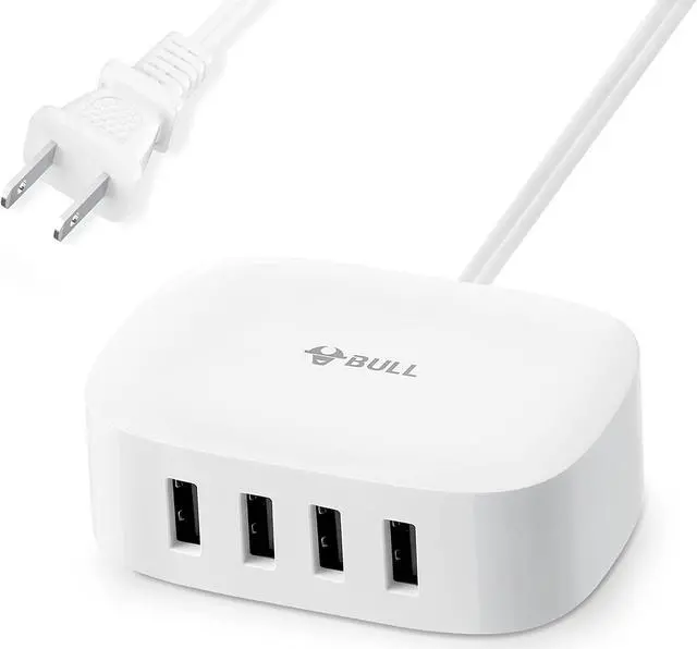 Space SaverThe sleek design of the 4 ports USB charger takes less space and makes the desktop clean and tidy, suitable for e-reader, bluetooth headphones, portable speakers and other device that charges with a USB cord, at the same time, it's suitable for a small nightstand and office desk, sofa etc.