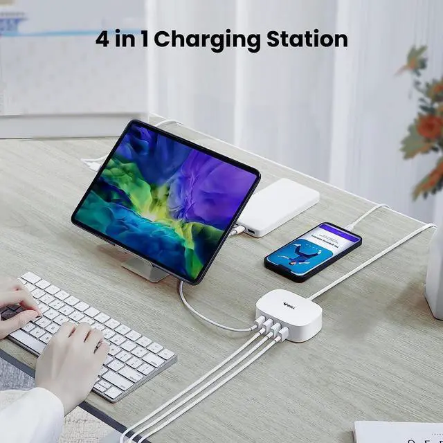 4-in-1 Charging StationThe 4 USB port charger (5V/5A max overall, each 2.4A max), total output power is 25W, charges 4 devices simultaneously, without extra adapters required, with only one multi USB charger, you can charge mobile phones, iPads, smart watches, cameras, etc.