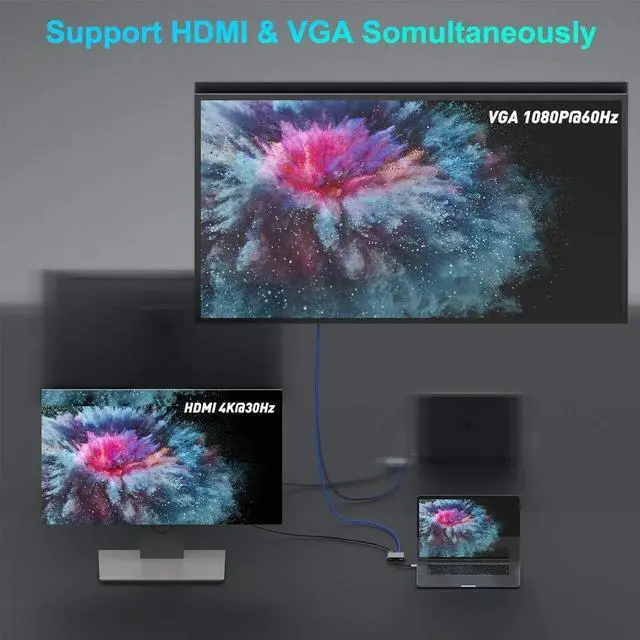 (Note: Not support connecting our hub to laptop's usb port by USB to USB C Adapter)USB C to HDMI VGA ConverterHDMI port max support 4K UHD 3840×2160@30Hz; VGA display in up to 1080P@60Hz Full HD. When two ports work simultaneously the maximum resolution of the two is 1920 x 1080P@60Hz.