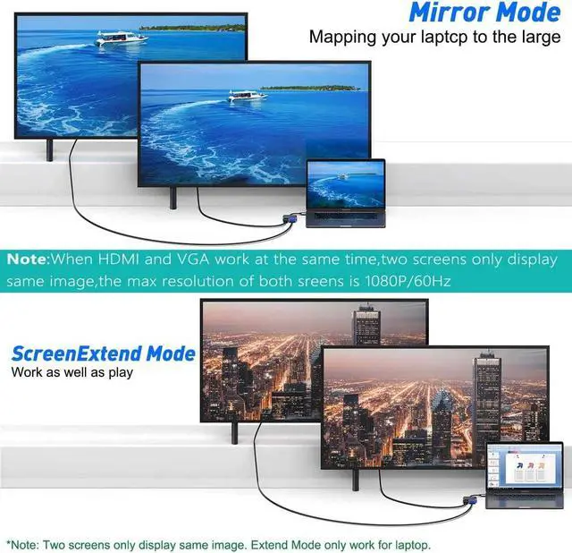 Note: Extend mode while vga and hdmi work at the same time 2 external monitors only show the same content. (Not support 2 monitors to display different content separately only can duplicated) Vivid 3D Effect Video SyncMirror or extend your screen with the USB-C Hubs HDMI and VGA Port stream 4K UHD or Full HD 1080p video to HDTV monitors or projectors for a cinema-like visual feast. USB 3.0 and Power Delivery Fast ChargingThe USB 3.0 port provide high speed data transfer speed up to 5 Gbps easy to transfer a HD movies in short time. Also support 87W PD charging for the USB-C laptop.