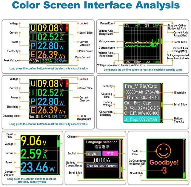 [Multiple Color Display Modes] Upgraded version offers 6 LCD primary color display interfaces, support to monitor real-time voltage, current, capacity, power, and CPU temperature of USB-C devices, while also recording peak current/voltage/power and time.Real-time voltage and current curve page allows you to instantly observe fluctuations and changes during charging; To analyze the curve over a specific period, you can long-pressing the confirmation key on this page to pause and resume the curve
