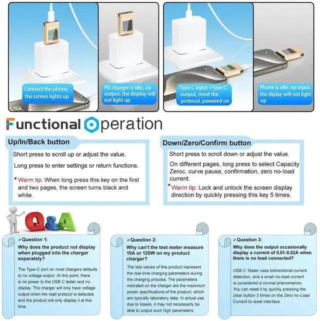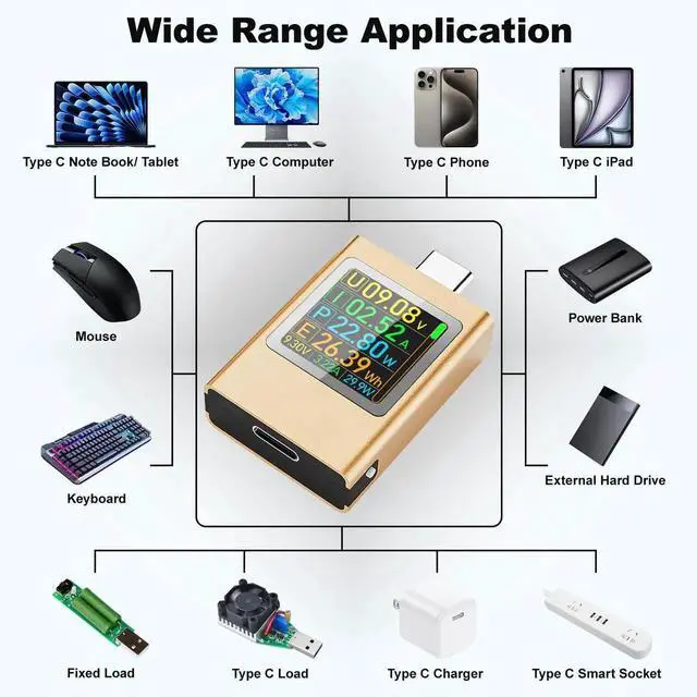 [Multifunctional USB-C Power Meter] Designed to detect the charging status and process of USB-C devices. Supports PD3.1 48V, PD2.0, PD3.0, PPS, OC2.0, QC3.0, FCP, SCPAFC, PE, DASH VOOC, SuperV00C and more protocols. Support to detect charging performance of USB-C chargers, cables, power banks, wireless chargers, laptops, smartphones, and other USB-C devices. With a measurement accuracy comparable to professional-grade instruments at ±0.1%, it is an essential tool for testing USB-C ports