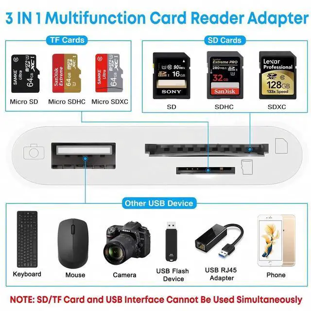 • [3-in-1 USB C SD Card Reader]SAMKE USB C to SD card reader with a SD port, a TF port and a USB 3.0 Port support read & write SD/TF port and USB 3.0 port work simultaneously to save the workload, suitable for camera, U disk, mice, keyboards or other peripherals.