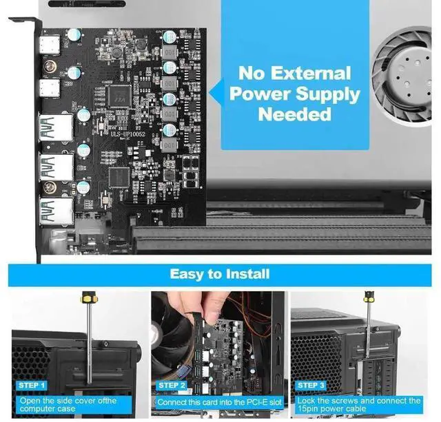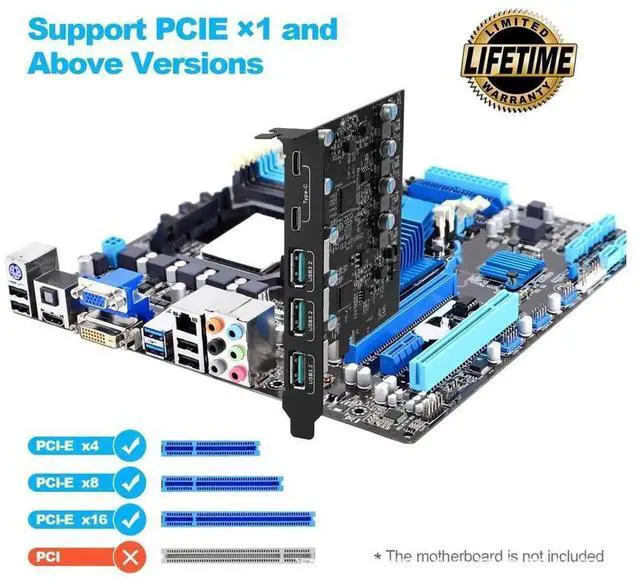 NOTE: 1. Not compatible with the old version of PCI Express X1 slot. 2. PCIe expansion card This only support data transmission, not video signal transmission (DP, HDMI). 3. Do not install this PCI-E card when the computer is turned on. 4. If the card does not work, check whether the PCI-E socket on the motherboard is faulty. 5. USB 3.0 /2, 0, 1.1 devices are only compatible with USB 3.2 cards, but they will not get the relevant speed because USB devices impose performance limitations on the throughput/performance of your data transfer. 6. In order to obtain USB 3.2 Super Speed+ performance, please use PCI-E 3.0 or higher version slot for card installation.