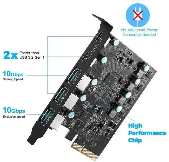 Product Advantages: 1. The 5 external USB ports of the PCI-E card adopt a stacked layout, which can save the space of the host. 2. Built-in YEELIYA self-powered technology, it is easy to install on the computer, without additional power supply. 3. The USB 3.2 gen 2 port has a total speed of 20Gbps bandwidth, realizing fast transmission for your USB device; in addition, pcie riser card has 2 differently designed USB C ports, support type-C devices such as smart phones and tablets for charging and file transfer.
