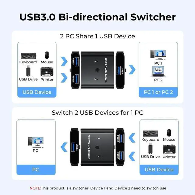 This USB 3.0 switcher has a simple design and easy to operate, allowing you to easily share a variety of USB devices, such as printers, scanners, mice, keyboards, card readers, etc., between two computers.