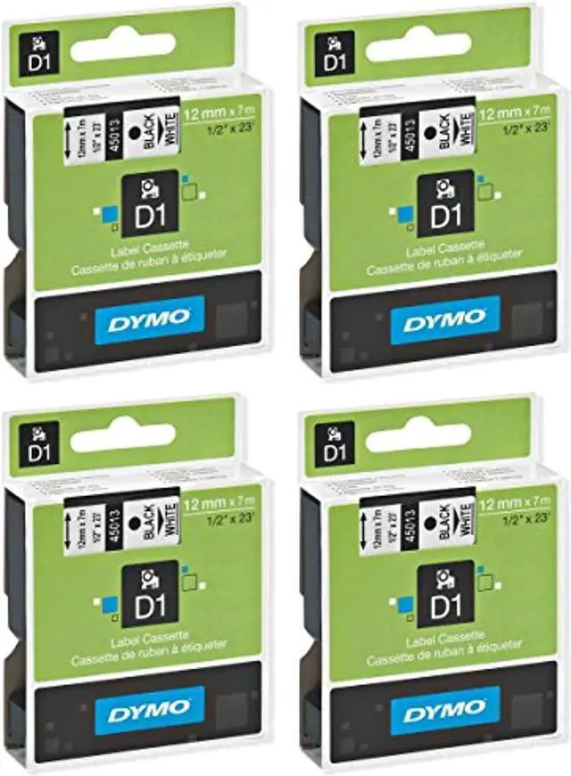 DYMO 45013 D1 Tape Cartridge for Dymo Label Makers, Created Specifically for Your LabelManager and LabelWriter Duo Label Makers, 1/2-inch x 23 Feet, Black on White, Pack of 4 Created specifically for your LabelManager and LabelWriter Duo label makers, DYMO D1 labels offer the performance and variety you need for most labeling jobs. They adhere to most clean, flat surfaces, including plastic, paper, metal, wood and glass, and feature easy-peel backing for trouble-free application 45013 D1 cartridges can be used with these printers: LabelManager 160, LabelManager 210D, LabelManager 210D Kit, LabelManager 260P, LabelManager 280, LabelManager PnP, LabelManager 360D, LabelManager 420P, LabelManager 450D, LabelManager Wireless PnP, LabelManager 500TS, and LabelWriter 450 Duo Versatile, durable D1 labels take the hassle out of home and office organization Key Features Pack of 4 Cartridges, easy Peeling for trouble-free application Available in black printing on white background Thermal transfer printing technology, no ink or toner required Adheres to most clean, flat surfaces including plastic, paper, metal, wood and glass Remove labels without leaving adhesive residue