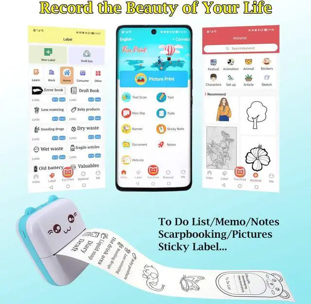 Powerful APP-The companion software Fun Print for our tiny printer has rich printing functions, including picture/label/list/document/website/QR code printing and so on. Besides, it also provides a wealth of print template materials such as label, festival, animation, animal, etc