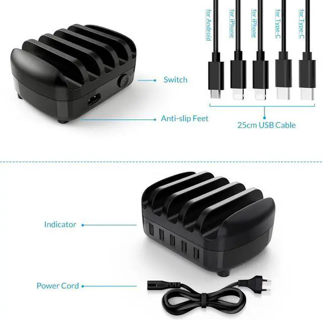 Charging: Smart Detect+Synchronous Rectification+Current Limit+Wide Voltage Features: 5 Stands for Phones/Tablets Cooling holes on the sides, keep running stable and stylish
