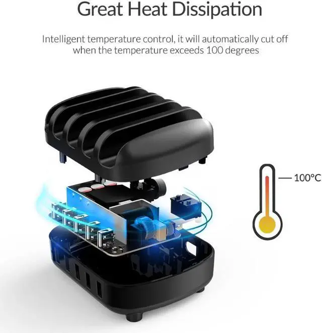 Mess and disorder caused by multi-devices charging may influence the experience of users. Each USB port with a corresponding stand and scientific slot depth for mobile phones, tablet and other electronic devices, clean and tidy. High endurance, active cooling fan; As cool as you can built-in active cooling fan, and ventilation holes on sides, make better heat dissipation, keeps it continuously running, stable and safe. Smart controller+MPS synchronous rectification, Dual technology, fast charging