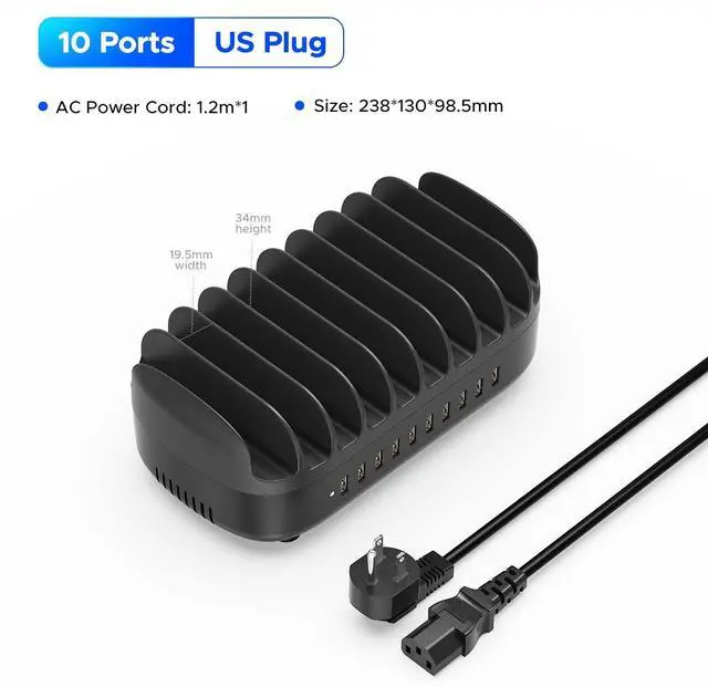 Intelligent Charging & Protection: Built-in surge, overcharge, overheat, short circuit, and overload protection. Smart chip automatically detects devices and optimizes output for max speed per port (5V/ 2.4A each, 120W total), charging 10 devices simultaneously at full speed.