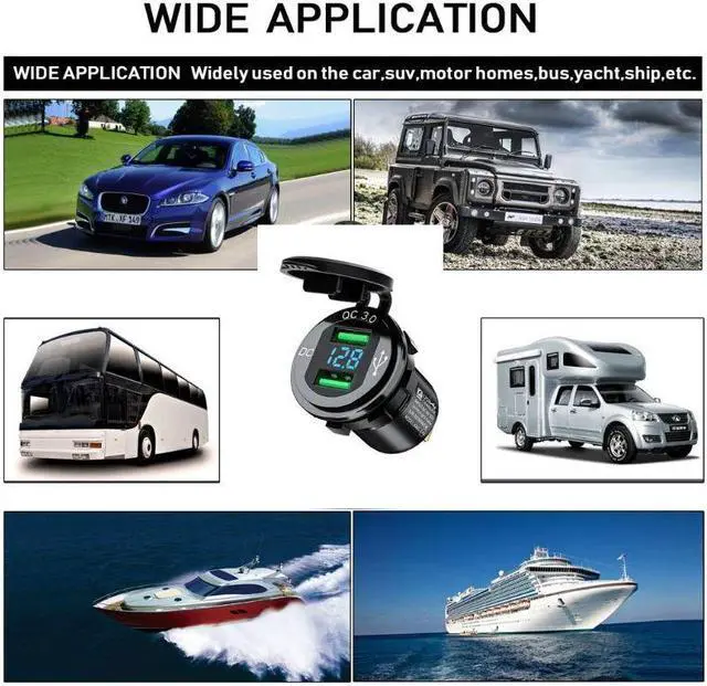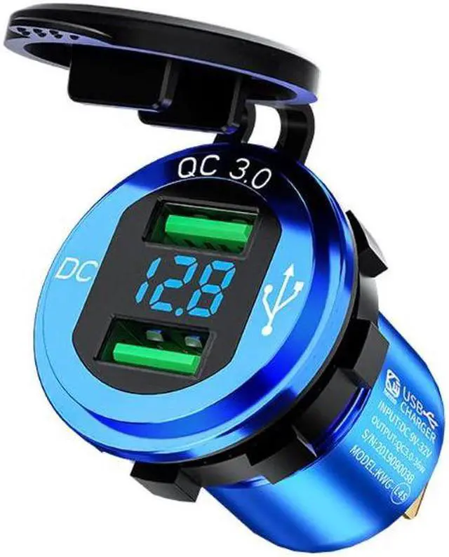 Description:100% brand new and high qualityWide Application: cars, motorcycles, ATVs, SUVs, UTVs, Boats, etcMulti-purposes: supply power for cellphone, tablet PC, GPS and other USB-devicesAn integrated usb charger socket with a LED voltage display that can show the voltage status of car battery in time. Very useful for car, boat, bike, SUV, ATV, RV car, campers and motorcycles, etc. Quick Charge 3.0 Designed with dual USB ports supporting QC 3.0, whose max single output is 18W. Built-in official smart chip, will intelligently detect your devices and simultaneously charging 2 devices at optimal current. Charge compatible devices up to 4 times faster than conventional charging.This QC 3.0 USB charger socket fits for 12-24V car, boat, marine, motorcycle, ATV, RV etc. Suitable for charging mobile phone, GPS, digital camera, PDA and other USB accessories, backward-compatible with QC 2.0 &1.0,provides standard charging for non-Quick Charge devices.Over-heated,over-current,over-charging protection, charging will be automatically stop when battery is full, easy to use and install
