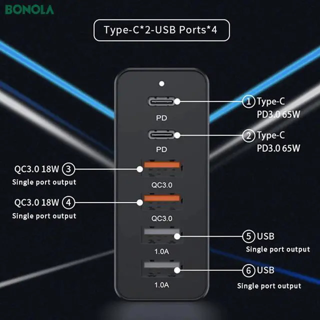 5 ports-maximum output up to 65W, high power efficiency. The output uses the latest intelligent power distribution technology,