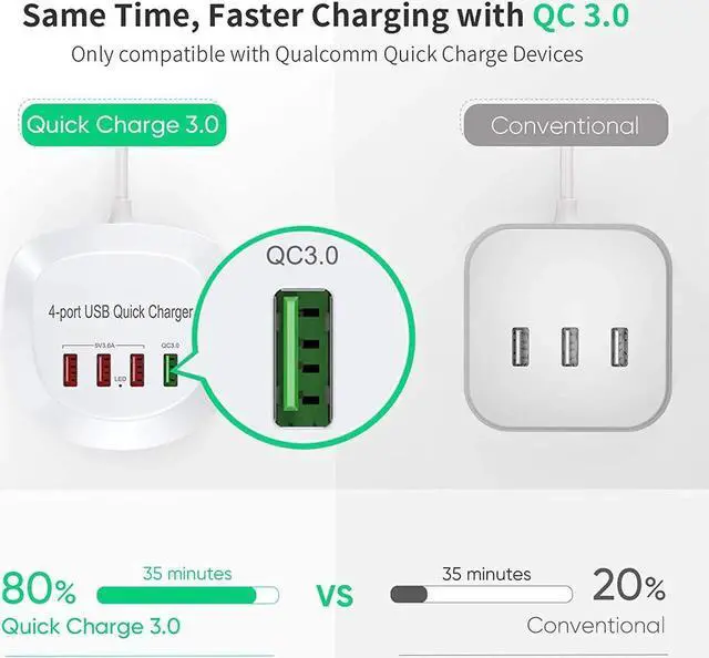 Quick Charge 3.0 Port: 5V/ 3.4A, 9V/2A, 12V/ 1.5A. The Quick Charge 3.0 port is 4 times faster than a normal USB port. QC fasting charging supports Qualcomm devices only, not compatible with Apple devices.