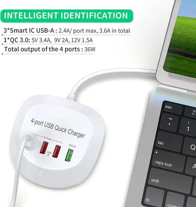 Devices: 3*5V/0- 2.4A USB ports, 1*QC 3.0 USB port, maximum total output is 36W. It will detect your devices automatically and deliver the optimal current to them. you can charge your phones, Bluetooth earphones and digital cameras simultaneously.