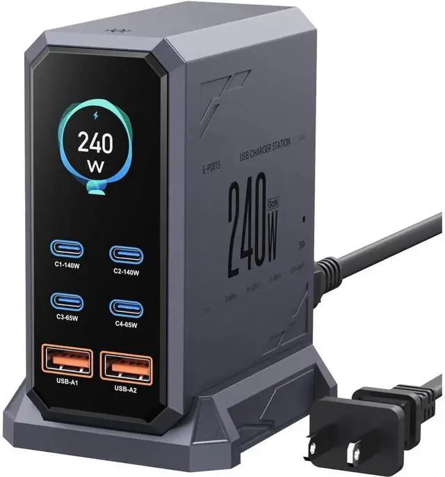 WISDUM IHDAPP 240W USB C Charger Block, 6 Ports USB Charging Station, GaN 140W PD 3.1 USB Charger, Laptop Fast Charger Adapter Desktop Charger Station with LCD Display for Laptops, Smartphones etc..