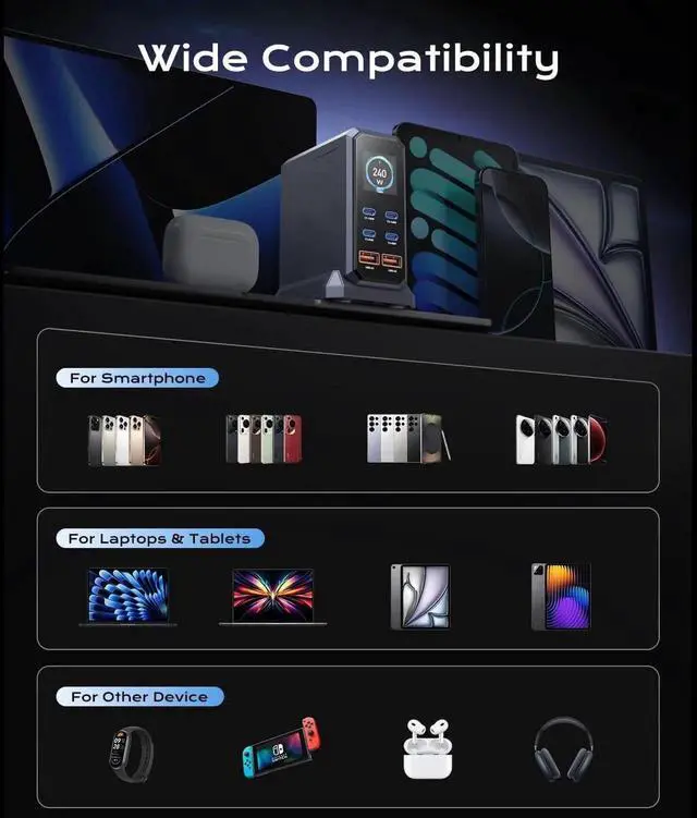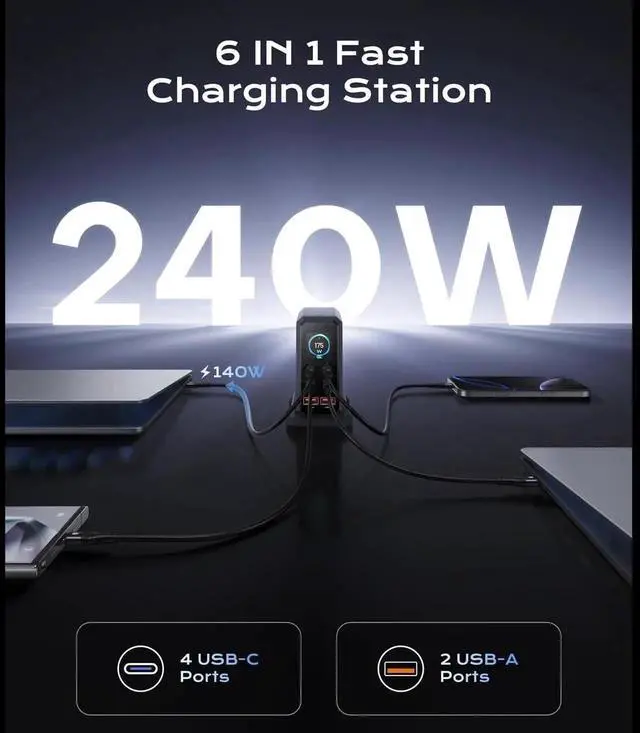 240W GaN Charger:Powered by GaN pro technology.protecting your multi devices from overcharging, overheating, short circuits, overcurrent, and overvoltage.Simple and powerful,save space,perfect solution to keep your desktop neat and organized.The usb c charging station suitable for home, office, travel.