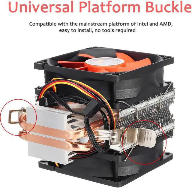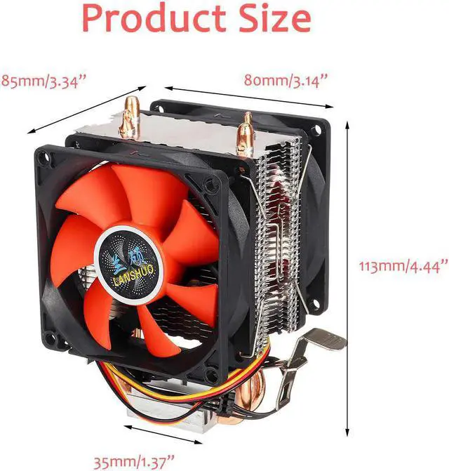 Specification:Product Name: Mini CPU CoolerModel: C00080Compatible CPU: for Intel/AMDHeatsink Material: Copper & AluminumSize:Product: 85*80*113mm/3.34"*3.14"*4.44"Fan: 80*80*25mm/ 3.14"*3.14"*0.98"Application: ProcessorBearing Type: HydraumaticPower Interface: 3 PinNoise: 22dBAType: HeatpipeFan Life: 50000 hrsFan Speed: 2200RPMHeat Pipes Quantity: 2Fan Quantity: 2Support CPU Platform: for Intel LGA 775/1150/1151/1155/1156 and AMD AM2 AMD3
