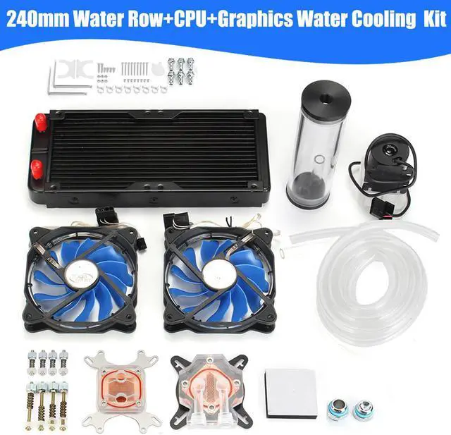 Features: CPU / GPU Block: Fast heat transfer, good heat dissipation Cylindrical Water Reservoir: The cylindrical water reservoir is manufactured from high quality transparent acrylic so that the circulation system is visible. Water Pump: Waterproof, stable, high quiet, long life. 240mm Heat Sink: Provide the excellent heat dissipation, as you need for highly overclocked desktop processors. Transparent Hose: Space-saving and durable LED Fan: high static pressure, low noise Application: Computer Water Cooling Kit Suitable for am3am3+ am2, not fit for am4. Package include: 1 x 240mm cold row 2 x LED fan 1 x general-purpose CPU + graphics cold head 1 set 1 x water tank length (160mm) 1 x 2 points transparent hose 1 meter 1 x SC600 water pump 1 x pipe fittings pagoda hose clamp set