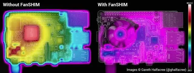 Make your Raspberry Pi 4 seriously cool with Fan SHIM! This 30mm no-solder, controllable CPU fan with RGB LED and tactile switch will give your Raspberry Pi significantly better thermal performance. It's whisper-quiet too!
