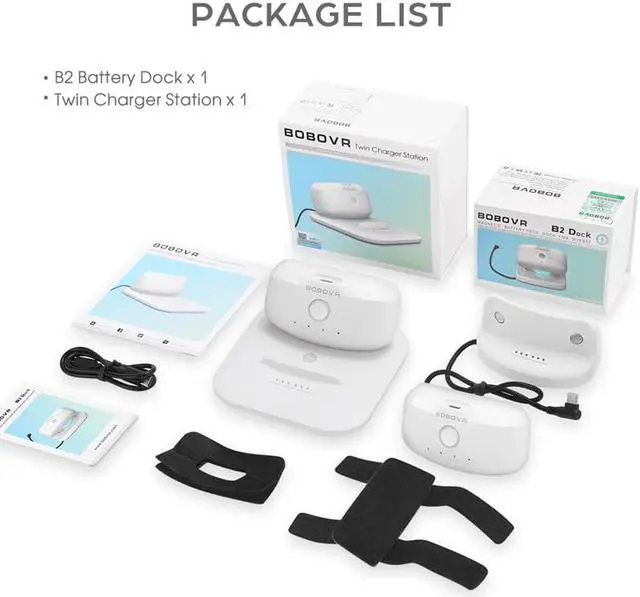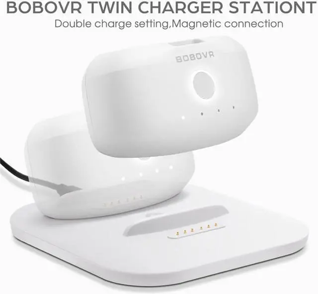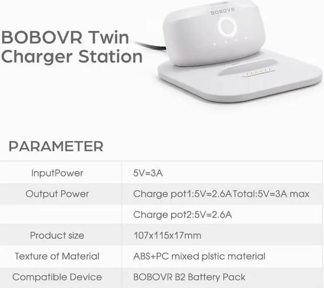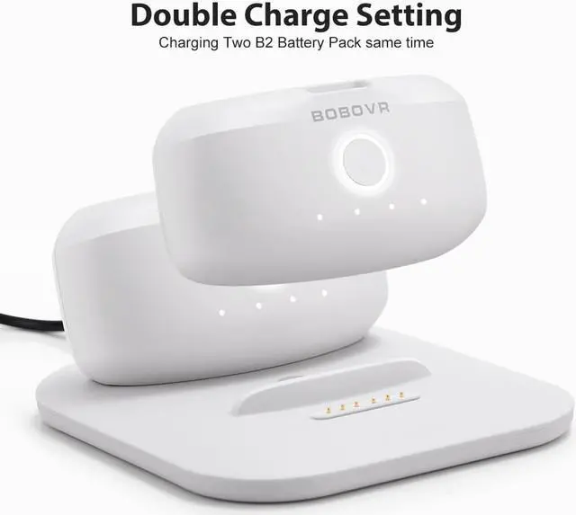 Dual charging design: The charging station adopts a very thin and simple language design, which saves desktop space and has 2 charging positions, which can charge 2 BOBOVR B2 battery packs at the same time;