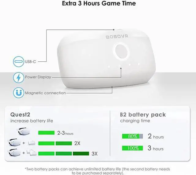 Magnetic quick-release design: The battery pack adopts a magnetic quick-release design, the battery can be removed and charged without affecting the use of Quest2. Two battery packs can achieve unlimited battery life (the second battery needs to be purchased separately);